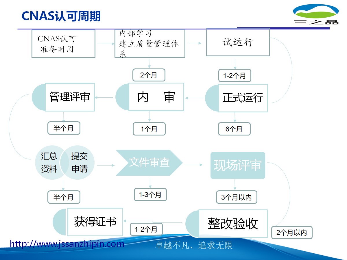 CNAS认可周期---一图看懂5、咨询承诺一 咨询质量的承诺 :如因三之品原因,造成贵公司不能通过CNAS的认可,三之品公司将退还所有咨询费用(包括由于第一次认证没有通过而额外产生的认证费用),并免费继续辅导贵公司,直至通过认证为止。二、提供的增值服务ü 换版培训ü 免费咨询,微信、电话、邮件ü 监督审核、复评审现场指导(每年免费一次) 三、三之品提供的培训售后服务ü 及时提供三之品公司...