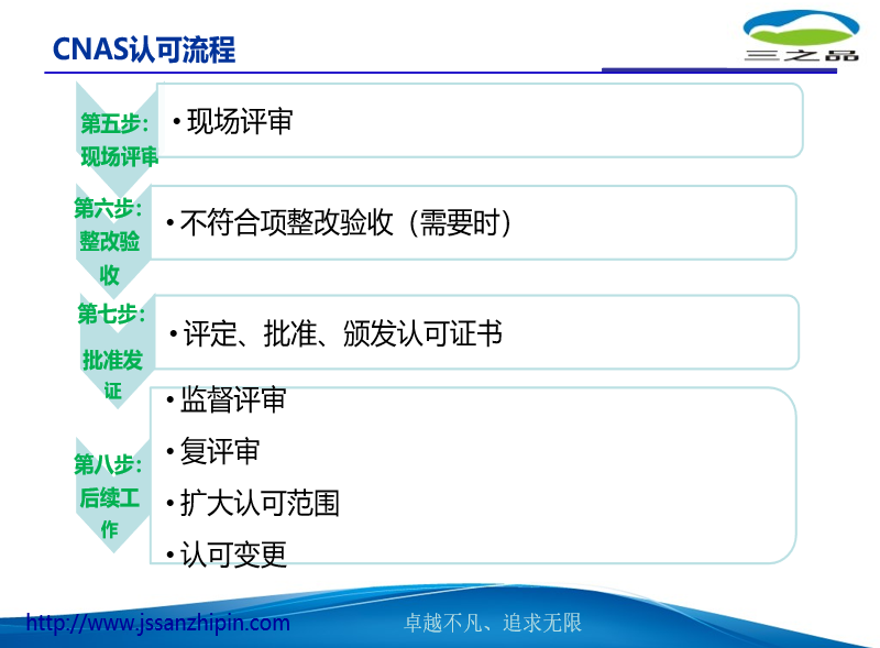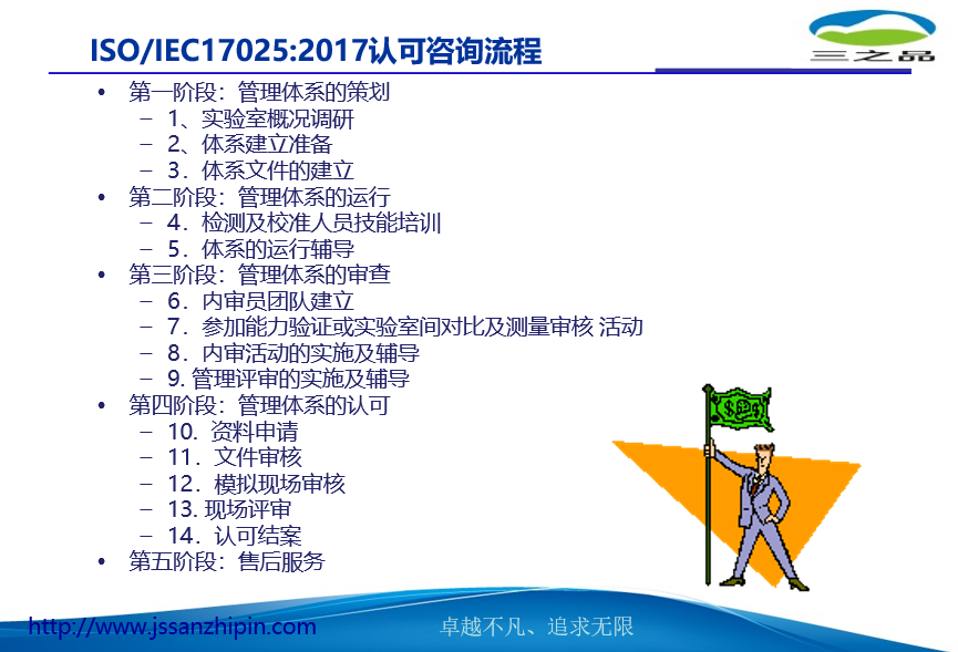 5、咨询承诺一 咨询质量的承诺 : 如因三之品原因,造成贵公司不能通过CNAS的认可,三之品公司将退还所有咨 询费用(包括由于第一次认证没有通过而额外产生的认证费用),并免费继续辅导 贵公司,直至通过认证为止。 二、提供的增值服务 ü 换版培训 ü 免费咨询,微信、电话、邮件 ü 监督审核、复评审现场指导(每年免费一次) 三、三之品提供的培训售后服务 ü 及时提供三之品公司最新行业信息及最新培训信息。 ü 培训结束后,将有专人对培训结果进行评估跟踪,讲师对培训课程中设计的实施方案将进行定期跟进结果并总结。 ü 提供全面、贴身设计的培训课程,灵活生动的教学方式及最新行业咨讯交流平台。可免费参加三之品组织的行业研讨会,为行业内客户之间信息的沟通与交流提供良机,达到多赢的效果。 6、咨询特点(一)细致周密的前期策划:顾问师小组为贵公司制订的计划分为:大计划、中计划和小计划三种。1、顾问师小组驻厂后,会根据体系诊断结果为 贵公司制定一个覆盖整个辅导过程的“大计划”;2、每月底,顾问师小组会配合推行委员会召开推行研讨会,研讨当月的工作情况及制订下月的工作计划,此谓“中计划”;3、每周顾问师辅导完毕离厂前,将书面向推行委员会呈报本周工作实绩及下周工作计划,此谓“小计划”。大、中、小计划循迴制订及实施,使影响体系运行的各种不利因素均在策划阶段消除,从而使企业在投资最少的情况下获得最大收益。(二)精诚合作的项目小组:1 针对贵公司的这次 ISO17025:2017 推行活动,我们将派出由两名资深实验室顾问师和一位客服专员担当组成的项目小组。其中一名顾问师为项目组长,将常驻贵公司进行全程辅导,另外一位顾问师将会在:集中培训、文件审核、内部审核、模拟审核这几个重要环节以团队方式出现。(三) 认真务实的驻厂咨询:在对 贵公司辅导过程中,项目组长将每月在贵公司辅导 3-4 个完整的工作日,全程在 30 人天左右,非现场咨询20人天左右。充足的驻场时间,保证了顾问师辅导的力度和深度。(四)严谨完善的课程安排:针对贵公司现有的管理基础,我们顾问师小组为贵公司准备的培训课程分为四大块:全员培训,中、高层管理人员培训,主要技术和质量人员培训以及内审员培训。具体培训内容参见“培训课程大纲”。(五)系统科学的辅导教材:针对上述的课程安排,我公司咨询部制定了一整套系统完善的辅导教材。顾问师驻厂咨询后,我们将免费提供一套(纸质版)教材给贵公司。7、培训服务项目